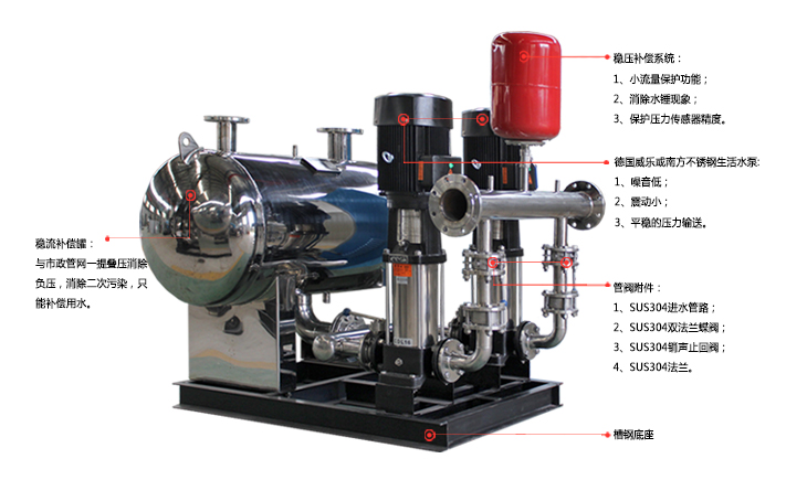 無負壓供水設備是由無負壓罐、泵組、控制柜、穩壓罐及管閥附件組成的供水設備,是將設備串聯在市政自來水管壓力不足的地方,設備通過壓力傳感器檢測出口壓力,將檢測值和設定值進行比較,運算出在市政自來水管的原有壓力基礎上需要增加的壓力值,確定水泵推入運行臺數和變頻器輸出頻率(反應到電機及水泵為轉速)以符合用水曲線實現恒壓,無負壓變頻供水設備大限度利用了市政自來水管網的原有壓力,對市政自來水管網不產生負壓,用無負壓罐取代老式水池,減少了用水二次污染,是供水領域的新一代節能型產品。